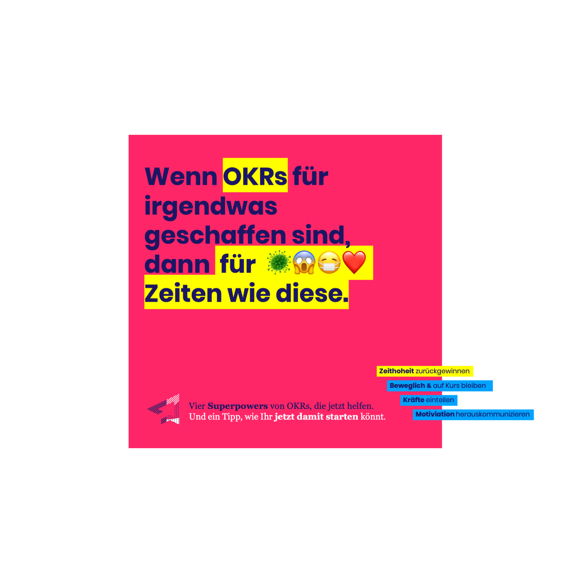 Teams und kleine Unternehmen können remote in 2 x 2 h die OKR-Methode verstehen und fürs Corona-Quartal ausprobieren.